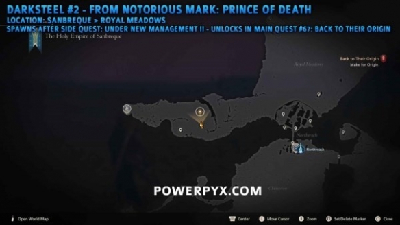 由恶名精英【死亡王子】掉落,位于桑布雷克皇家孪晶丘陵西侧草地(需要先完成主线任务67始源期间的支线任务后才会出现)。下方第一张图片为任务初始位置,第二张图片为任务结束后怪物的位置。